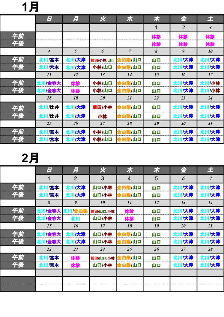 令和8年1月/2月担当医カレンダー